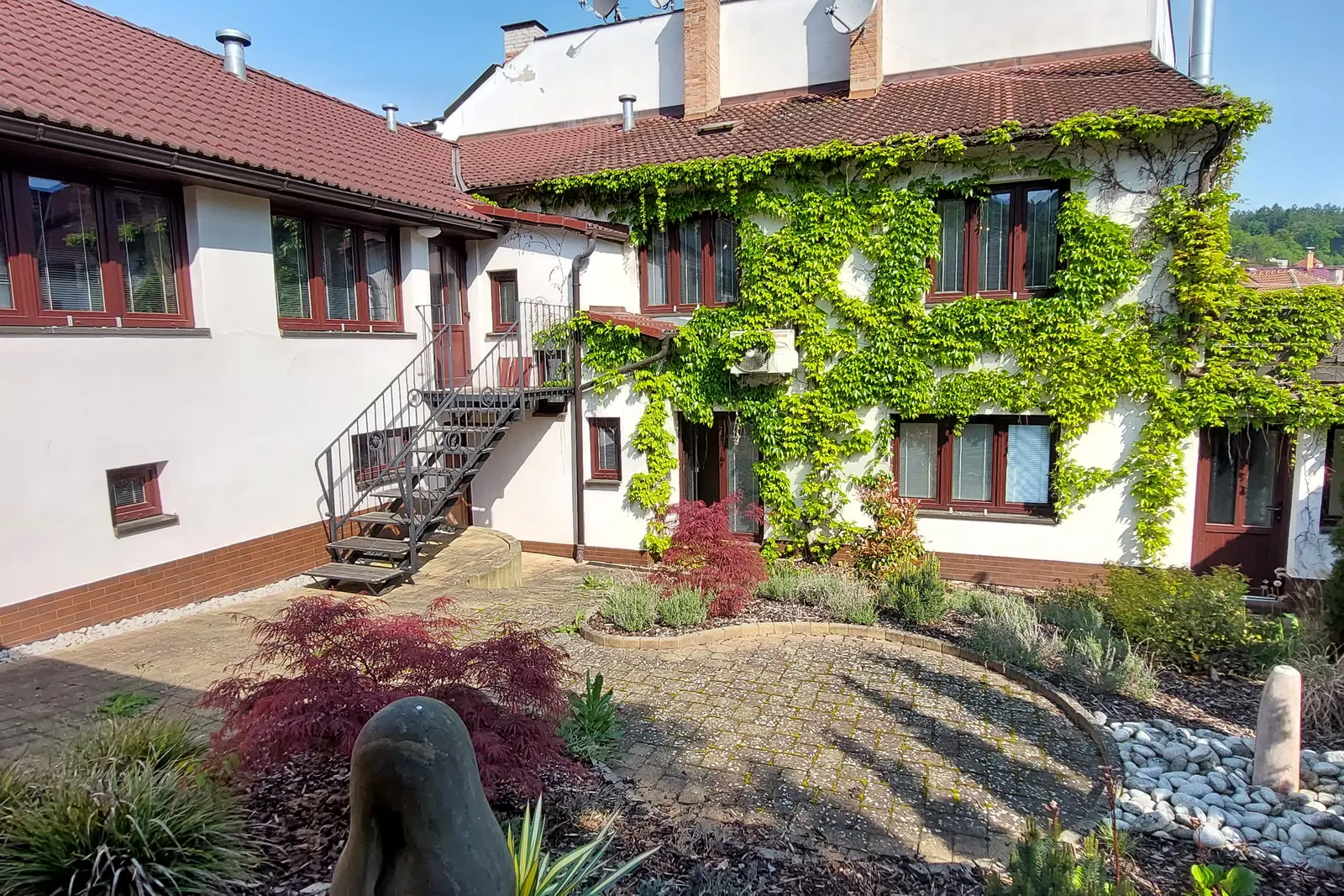 Ve dvorním traktu budovy je vybudováno posezení s altánem, které má velmi příjemné soukromí mezi budovami. Plocha zahrady je cca 200 m2. Užitná plocha domu je cca 250 m2.