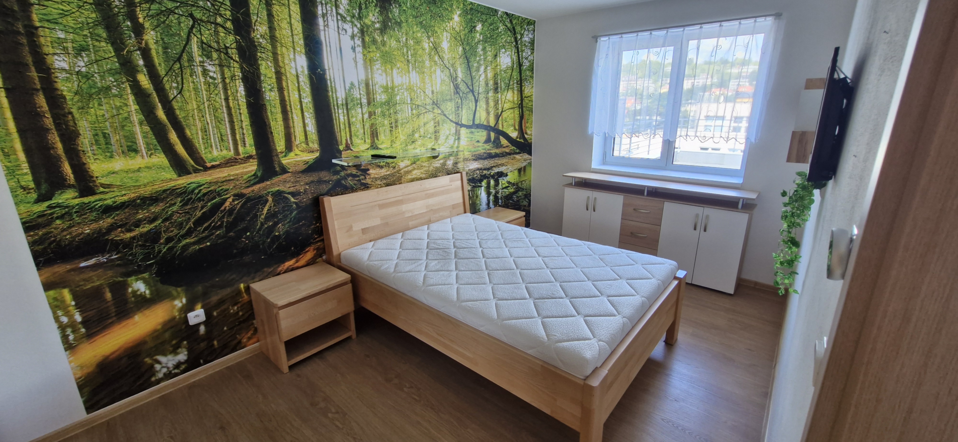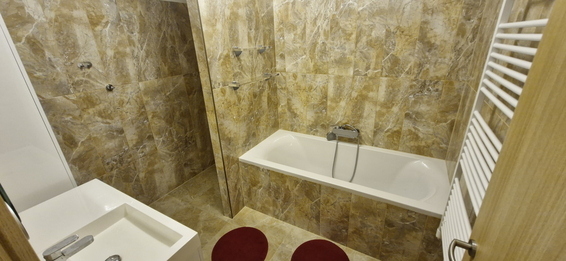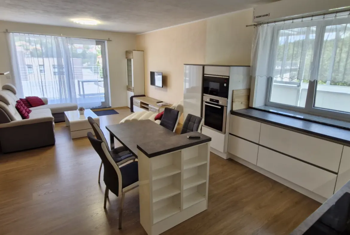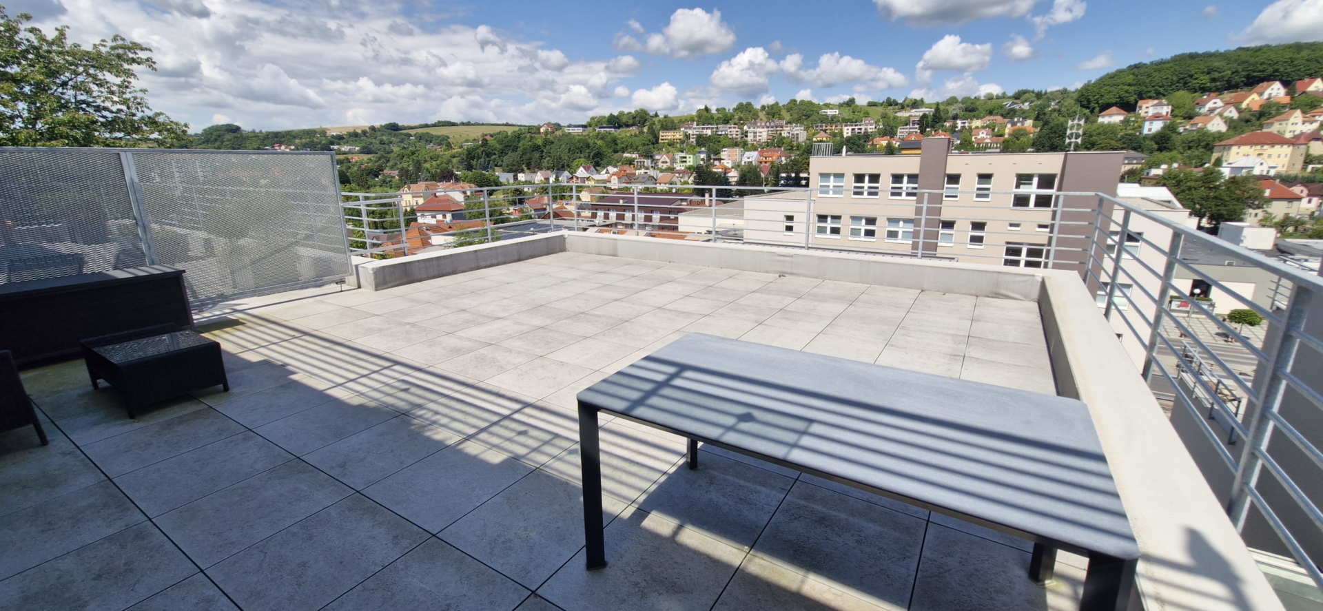 Dominantou je prostorná terasa o výměře 54 m² s krásným panoramatickým výhledem na město a okolní krajinu, která poskytuje dostatek soukromí i prostoru k odpočinku. Byt má podlahovou plochu 54 m² a praktickou dispozici s obývacím pokojem a kuchyňským koutem vybaveným vestavěnými spotřebiči. Samozřejmostí je moderní koupelna s vanou i sprchovým koutem a vinylové podlahy.